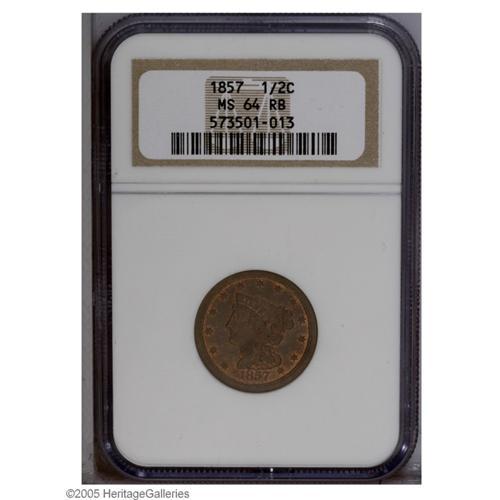 1857 1/2 C MS64 Red and Brown NGC. B-1, C-1, R.2. The 1857[1/2 C] MS64 Red and Brown NGC.