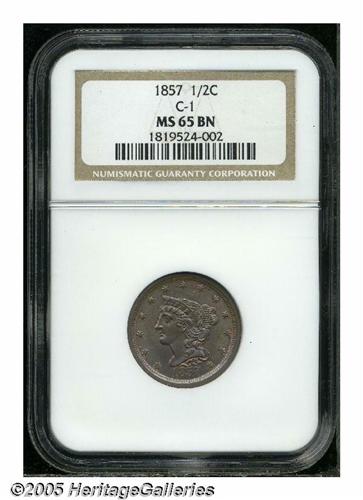 1857 1/2 C MS65 Brown NGC. B-1, C-1, R.2. Abundan