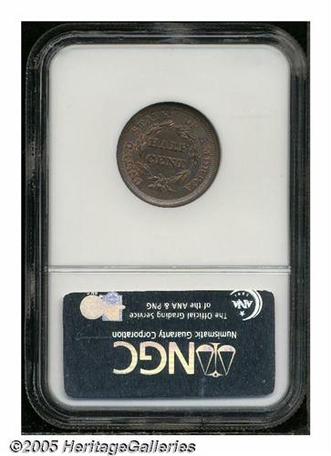 <B>1857<1/2 C> MS65 Brown NGC.</B></I> B-1, C-1, R.2. Abundant glimpses of gold color frequent protected areas. Medium brown patina fills the fields and devices. A well struck and shimmering Gem. A minor spot on the nose, and a faint graze near star 11. From the final, low mintage date of the denomination.