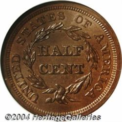<table><tr><td><table><tr><td>1857 1/2 C MS65 Brown NGC. B-1, C-1, R.2. An impressive golden-brown Gem with moderately satiny surfaces. There is no remotely mentionable contact that disturbs the smooth fields. Well struck, since even the denticles are clearly defined. Only 35,180 pieces were struck, as production of the denomination ceased in 1857 due to the similarly sized small cent. Population: 7 in 65 Brown, 1 finer (3/04).From the Robert Bowling Collection. <BR><BR><B>Important notice:</B> Heritage usually auctions material at the rate of 200-250 lots per hour. On some occasions eBay Live bid software or the Internet may not be able to keep up with the pace of the auction. We recommend placing a realistic absentee bid now as insurance to avoid disappointment. Occasionally the auctioneer may eliminate or reject an eBay Live bid, and the auctioneer may also reopen a lot after the close of the eBay live bidding (usually because we missed an audience bid), and may reject your bid even if it shows you as the winning bidder. By bidding via eBay Live, you agree that Heritage may award the lot to another bidder at its sole discretion under the circumstances described above or any other reasonable circumstances. Since eBay bids are not shown to us until we open the lot on the floor, we treat those bids just like floor bids. In most cases the floor responds before the eBay bid is presented to us, due to Internet lag time, so for consistency we have made it a policy that floor bids are always considered first over tie eBay live bids. Also please note that all Heritage lots purchased through eBay Live carry a 20% Buyer's Premium. Please make sure you read the Terms and Conditions before you bid. <BR><BR><B>IMPORTANT ANNOUNCEMENT ABOUT RESERVES:</B> Heritage now divulges all reserves on its web site 7 days before every auction. If you want to know whether the reserve on this lot has been met, and if not, what the reserve amount is, please visit this lot page on the HeritageCoin.com web site, or email: bid@HeritageGalleries.com </span></font></td></tr></table></td></tr></table>