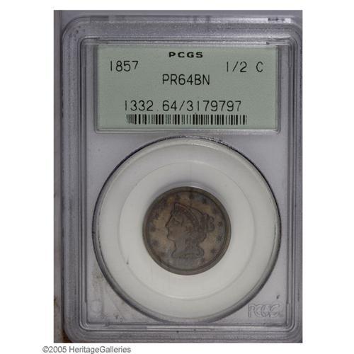 1857 1/2 C PR64 Brown PCGS. B-2, R.4. This variety was 1857[1/2 C] PR64 Brown PCGS.