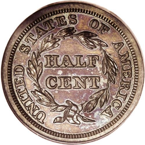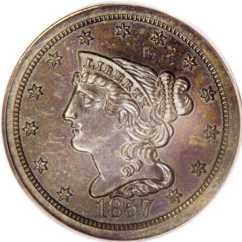 <B>1857<1/2 C> PR64 Brown PCGS.</B></I> C-1, B-2, R.4. The letters CNT in CENT are recut, and the reverse is lightly strike doubled. Predominately a greenish-brown color, the fields have iridescent magenta-red, blue and gold undertoned as the coin turns under a light. The strike is amazingly sharp, with details on the wreath leaves and hair curls that no business strike could hope to approach. There is a raised, mint-made lintmark on Liberty's jaw, with the surfaces otherwise completely undisturbed. The last year of the denomination. EAC PR60+. Population: 13 in 64, 3 finer (7/06).