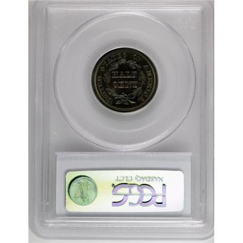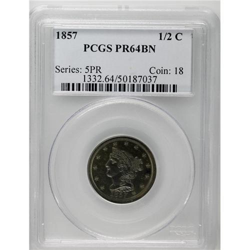 1857 1/2 C PR64 Brown PCGS. C-1, B-2, R.4. The letters