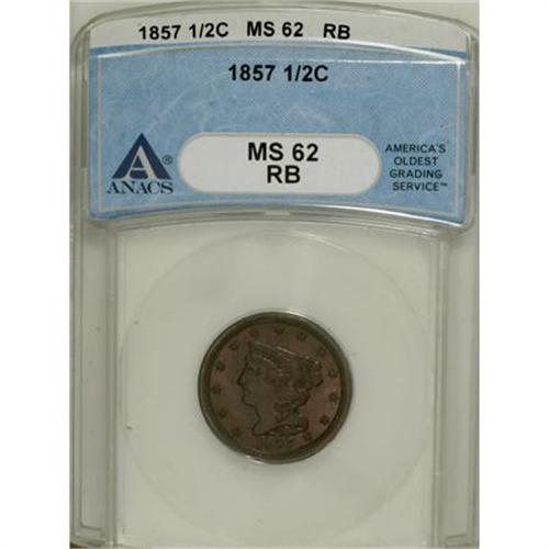 <B>1857 1/2 C MS62 Red and Brown ANACS.</B></I> NGC Census: (10/103). PCGS Population (22/102). Mintage: 35,180. Numismedia Wsl. Price for NGC/PCGS coin in MS62: $326. (#1240)<BR><BR><B>Coin Engraver:</B> Christian Gobrecht<BR><BR><b>Shipping:</b> Coins & Currency (<a target="_blank" href="http://www.heritageauctions.com/common/shipping.php">view shipping information</a>)