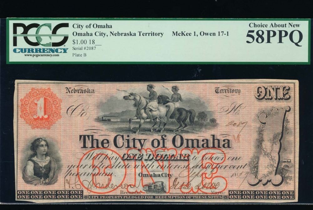 One 1857 $1 City of Omaha Note PCGS 58PPQ.