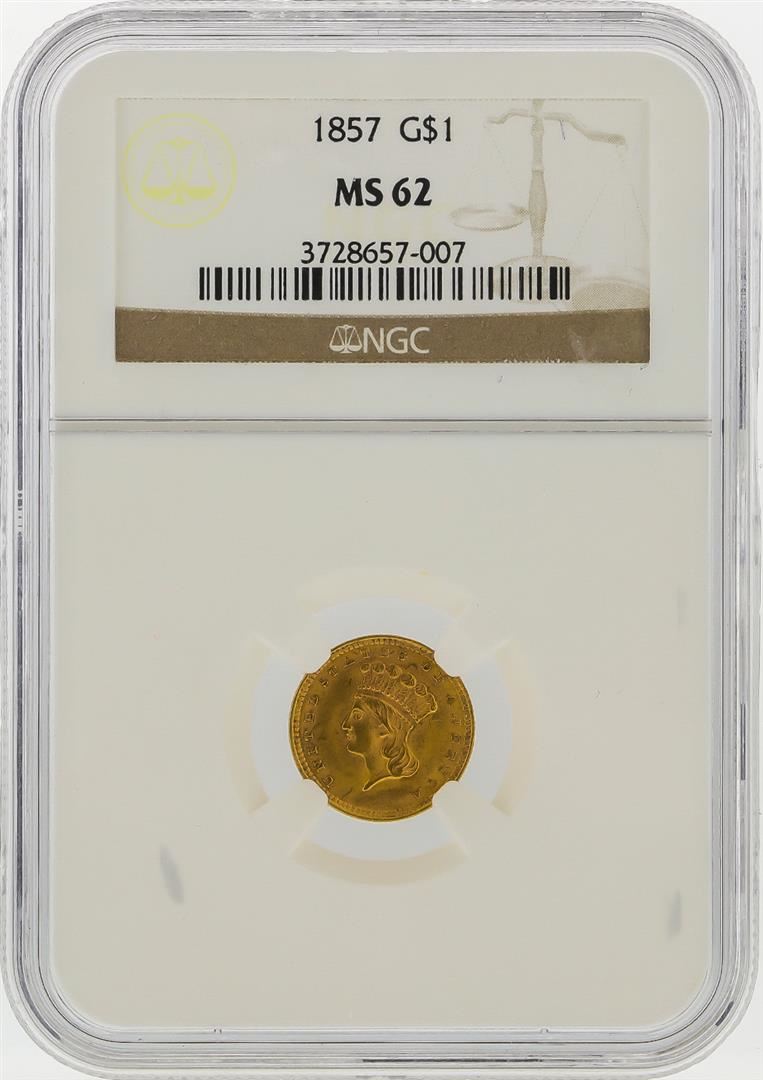 One 1857 $1 Indian Princess Head Gold Coin NGC Graded MS62. NGC Certified.