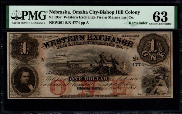 One 1857 $1 Omaha City NE Note PMG 63.