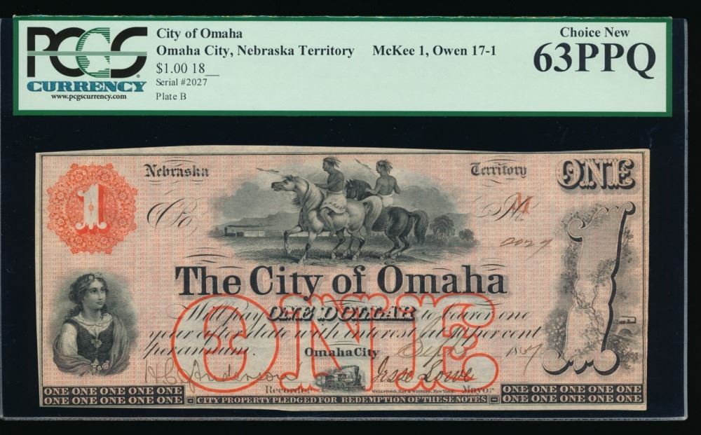 One 1857 $1 Omaha Obsolete Scrip Note PCGS 63PPQ.