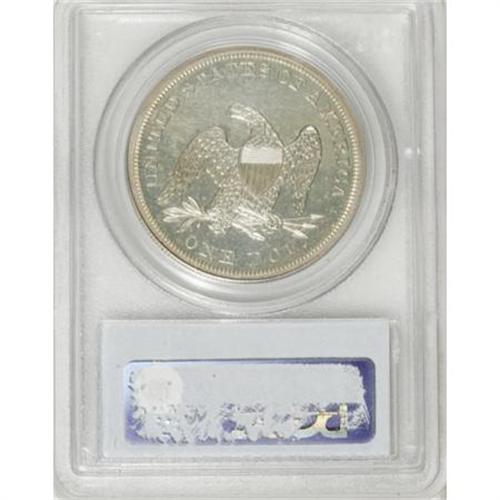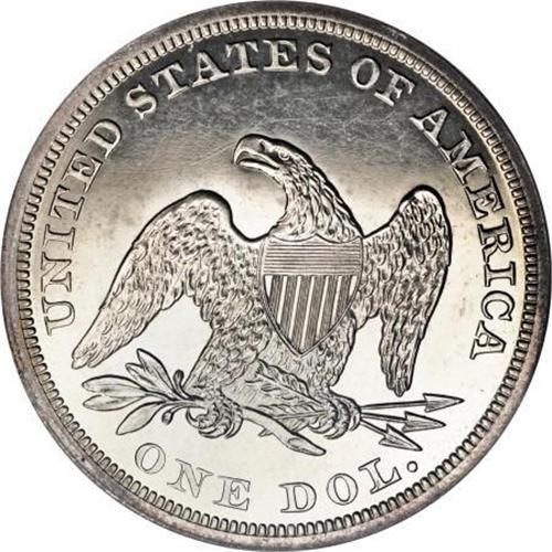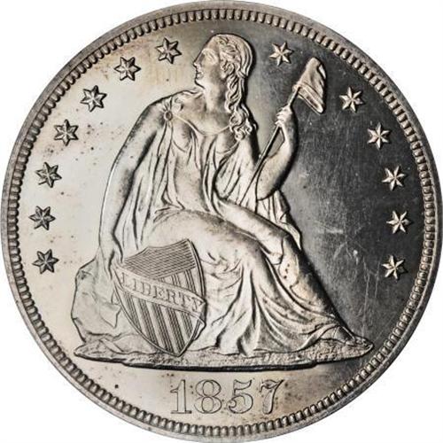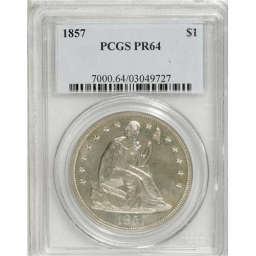 <B>1857 $1 PR64 PCGS.</B></I> Pre-1858 proof coinage of any denomination is scarce, but those from 1857 are generally more available than other early pre-mass production years. Mintages prior to 1858 are unknown and largely a matter of conjecture. It is generally believed that somewhere between 50 and 100 proof dollars were struck. Of that number, probably no more than 40-50 are known today in all grades. High grade pieces such as this one are rarely encountered. Only 11 near-Gems have been certified by PCGS with NGC grading another 13. Above this level, only eight coins have been graded. The fields on this piece are bright and highly reflective. Fully struck, the surfaces are mostly brilliant with just a smattering of pale golden-brown patina seen on the obverse. <BR><BR><B>Coin Engraver:</B> Christian Gobrecht<BR><BR><b>Shipping:</b> Coins & Currency (<a target="_blank" href="http://www.heritageauctions.com/common/shipping.php">view shipping information</a>)