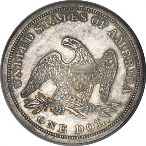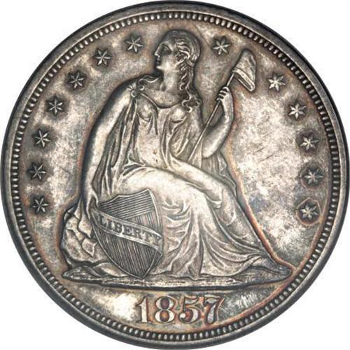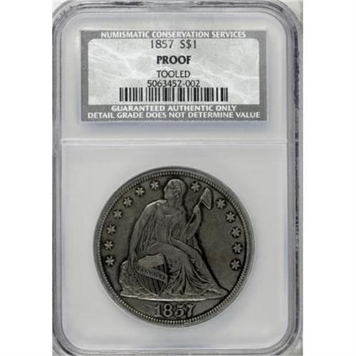 <B>1857 $1 --Tooled--NCS. Proof.</B></I> Tooling is evident on several localized areas, most notably Liberty's hair and the lower reverse border. Whispers of gold, purple, and green cling to the design elements, especially to those on the obverse. A well executed strike leaves sharp definition.<BR><BR><B>Coin Engraver:</B> Christian Gobrecht<BR><BR><b>Shipping:</b> Coins & Currency (<a target="_blank" href="http://www.heritageauctions.com/common/shipping.php">view shipping information</a>)