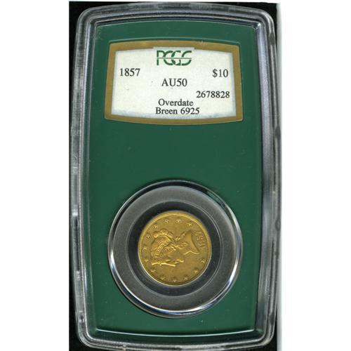 <B>1857<$10> AU50 PCGS.</B></I> Overdate, Breen-6925. "Curve of another digit between 57, touching the curve of 5 and the serif of 7. It is uncertain if this is part of another 5, another 7, or a 6. Extremely Rare." While uncertain whether the line between the digits is from any of the suggested sources, there is no question that this is, indeed, the variety stated, and that as a date, the 1857 is underrated. Smooth, evenly worn surfaces display a reddish-golden patina, but reveal no individually significant marks or other distractions. A rare opportunity for the variety collector. Housed in a large, green PCGS Regency holder.<BR><I>From The Steve Glenn Collection.</B></I> <BR><BR><B>Important notice:</B> Heritage usually auctions material at the rate of 200-250 lots per hour. On some occasions eBay Live bid software or the Internet may not be able to keep up with the pace of the auction. We recommend placing a realistic absentee bid now as insurance to avoid disappointment. Occasionally the auctioneer may eliminate or reject an eBay Live bid, and the auctioneer may also reopen a lot after the close of the eBay live bidding (usually because we missed an audience bid), and may reject your bid even if it shows you as the winning bidder. By bidding via eBay Live, you agree that Heritage may award the lot to another bidder at its sole discretion under the circumstances described above or any other reasonable circumstances. Since eBay bids are not shown to us until we open the lot on the floor, we treat those bids just like floor bids. In most cases the floor responds before the eBay bid is presented to us, due to Internet lag time, so for consistency we have made it a policy that floor bids are always considered first over tie eBay live bids. Also please note that all Heritage lots purchased through eBay Live carry a 20% Buyer's Premium. Please make sure you read the Terms and Conditions before you bid. This lot is being auctioned in conjunction with a live floor auction by Heritage Galleries & Auctioneers. All final auction and invoice information will be supplied by Heritage Galleries & Auctioneers, and all other information should be considered preliminary. Lot:3947 <BR><BR><B>Winning Notification and Billing:</B> After the FINAL session in this auction is complete, Heritage will send e-mail and snail mail invoices. This process normally takes several days. All final auction and invoice information will be supplied by Heritage Galleries & Auctioneers, and all other information should be considered preliminary. <BR><BR>This auction will be conducted on a live auction floor and over the Internet through eBay Live. If you choose to place an absentee bid, please take a moment to <font color='#0000ff'><u><a href='http://pages.ebay.com/liveauctions/help/before/laabsentee.html'>learn how eBay Live absentee bidding works</a></u></font><font color='#000000'>