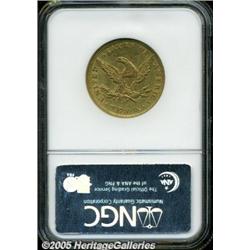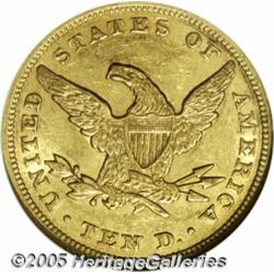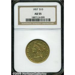 <B>1857 $10 AU55 NGC.</B></I> An attractive example of this scarcer issue that has an impressively low mintage of only 16,606 pieces. This piece is light in color, with slight softness of strike on the highpoints, and small scattered abrasions. Each side exhibits a slightly subdued appearance.