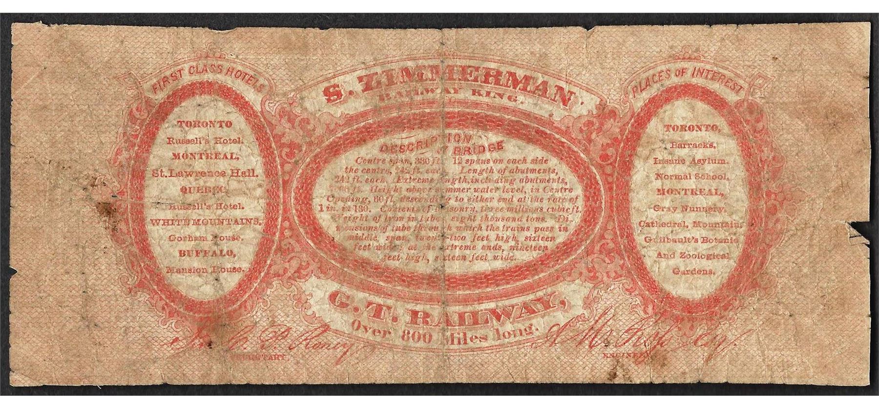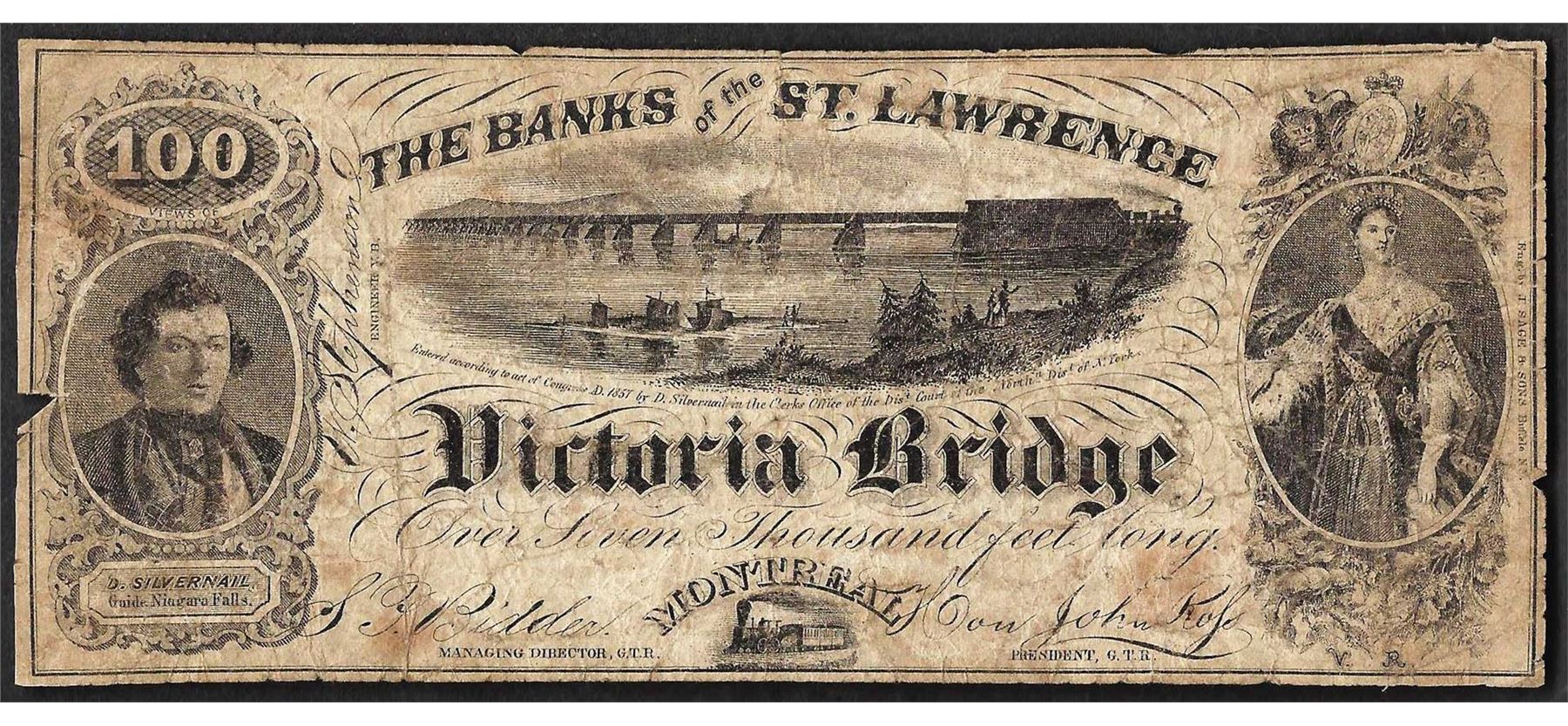 One 1857 $100 Banks of St. Lawrence Victoria Bridge Montreal Note.