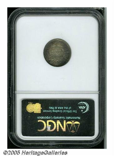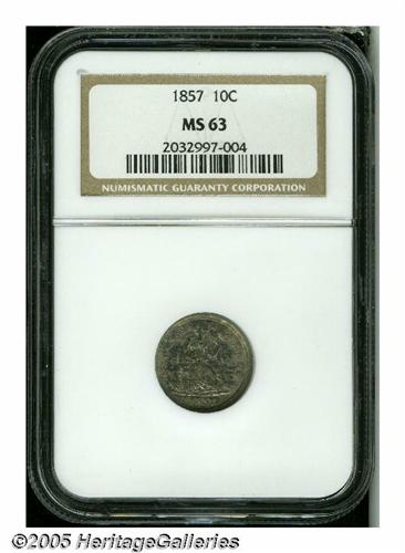 <B>1857<10C> MS63 NGC.</B></I> Dappled apple-green and plum colors adorn this satiny and nicely struck Seated Dime. Portions of the denticles are softly impressed, but the strike is otherwise crisp.