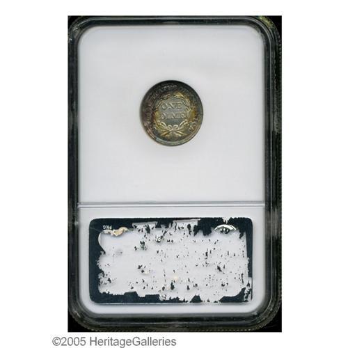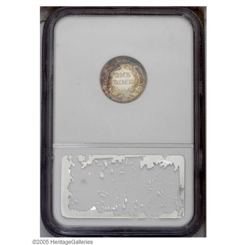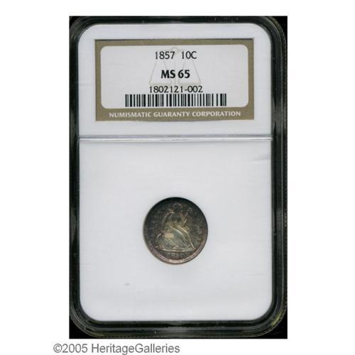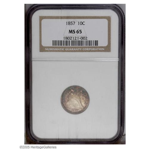 <B>1857<10C> MS65 NGC.</B></I> This richly toned example displays competing swirls of lavender-charcoal, steel-blue, golden-orange, and lilac colors throughout. A few of the highpoints are softly impressed, the balance of the features are sharp and distraction-free. A nice candidate for inclusion in an originally toned, Gem quality type set. Population: 31 in 65, 10 finer (9/05).