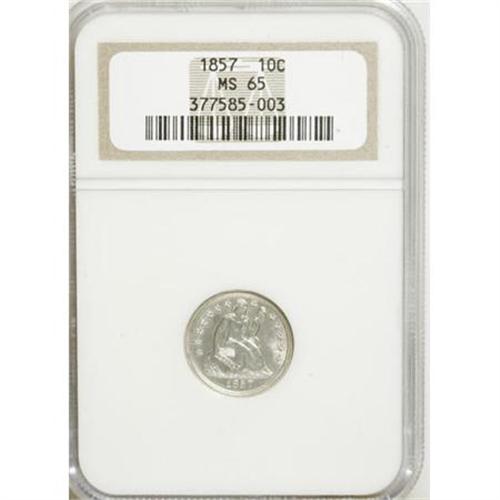 <B>1857 10C MS65 NGC.</B></I> Boldly detailed and minimally toned with soft, yet pleasing luster. This pleasing pre-war Gem offers exquisite preservation. Census: 33 in 65, 12 finer (10/07).<BR><I>From The Parker Lee III Collection.</B></I><BR><BR><B>Coin Engraver:</B> Christian Gobrecht<BR><BR><b>Shipping:</b> Coins & Currency (<a target="_blank" href="http://www.heritageauctions.com/common/shipping.php">view shipping information</a>)