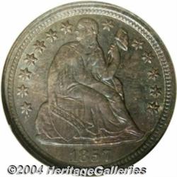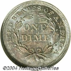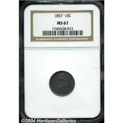 <B>1857<10C> MS67 NGC.</B></I> This richly toned example displays competing swirls of deep cobalt-blue and crimson-magenta colors throughout. Some of the highpoint detail at the top of the obverse is softly impressed, the balance of the features are sharp and distraction-free. Currently (7/04) this is the single finest example graded by NGC and is tied with one other MS67 at PCGS. A perfect candidate for inclusion in an originally toned, Superb Gem quality type set. <BR><BR><B>Important notice:</B> Heritage usually auctions material at the rate of 200-250 lots per hour. On some occasions eBay Live bid software or the Internet may not be able to keep up with the pace of the auction. We recommend placing a realistic absentee bid now as insurance to avoid disappointment. Occasionally the auctioneer may eliminate or reject an eBay Live bid, and the auctioneer may also reopen a lot after the close of the eBay live bidding (usually because we missed an audience bid), and may reject your bid even if it shows you as the winning bidder. By bidding via eBay Live, you agree that Heritage may award the lot to another bidder at its sole discretion under the circumstances described above or any other reasonable circumstances. Since eBay bids are not shown to us until we open the lot on the floor, we treat those bids just like floor bids. In most cases the floor responds before the eBay bid is presented to us, due to Internet lag time, so for consistency we have made it a policy that floor bids are always considered first over tie eBay live bids. Also please note that all Heritage lots purchased through eBay Live carry a 20% Buyer's Premium. Please make sure you read the Terms and Conditions before you bid. </span></font></tr></table></td></tr></table>