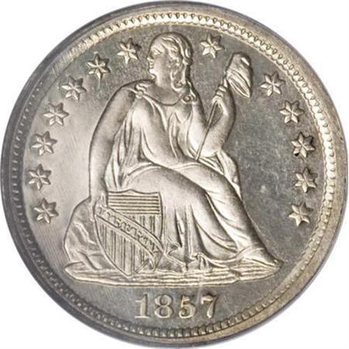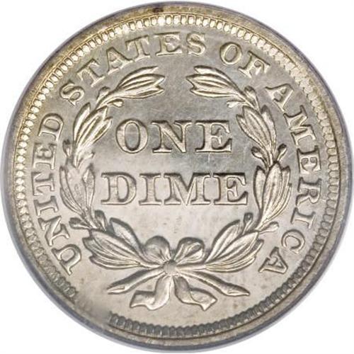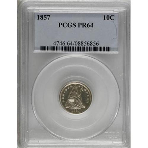 <B>1857 10C PR64 PCGS.</B></I> It was during the later half of the 1850s that enough demand finally existed for annual production of proofs for the fledgling American numismatic market. The success of the 1856 Flying Eagle cent prototype may have been partly responsible for the new wave of interest, but it wasn't until 1858 that the issuance of proofs began in earnest. An unknown, but obviously small mintage of proof dimes was released to collectors in 1857 and only a few dozens specimens are believed to survive. This brightly mirrored example is untoned and free from the lintmarks that are often found on this issue. Population: 8 in 64, 4 finer (7/07).<BR><BR><B>Coin Engraver:</B> Christian Gobrecht<BR><BR><b>Shipping:</b> Coins & Currency (<a target="_blank" href="http://www.heritageauctions.com/common/shipping.php">view shipping information</a>\)