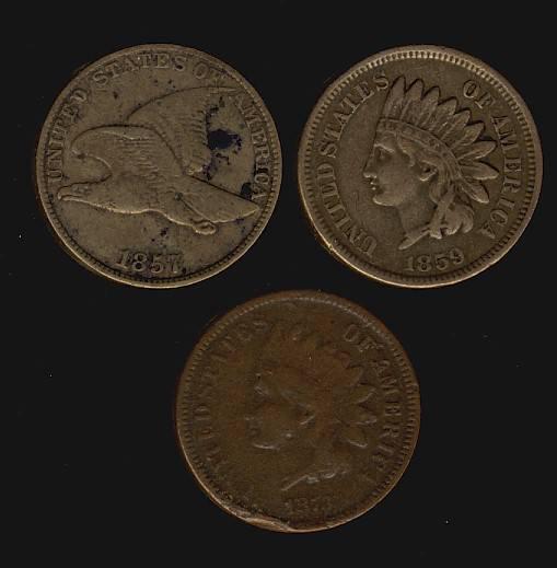 1857, 1859 and 1873 US 1¢. Fine to VF