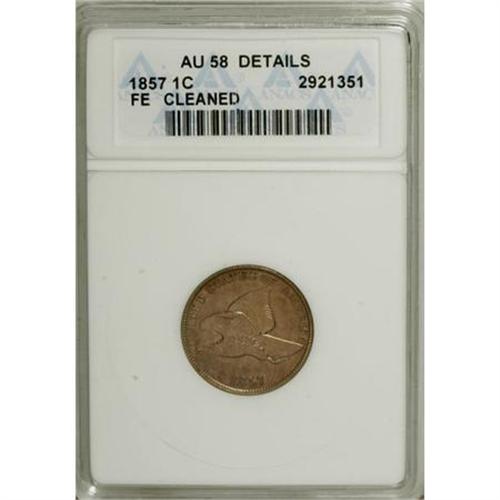 <B>1857 1C --Cleaned--ANACS. AU58 Details.</B></I> NGC Census: (89/1766). PCGS Population (147/2059). Mintage: 17,450,000. Numismedia Wsl. Price for NGC/PCGS coin in AU58: $192. (#2016)<BR><BR><B>Coin Engraver:</B> James B. Longacre<BR><BR><b>Shipping:</b> Coins & Currency (<a target="_blank" href="http://www.heritageauctions.com/common/shipping.php">view shipping information</a>\)