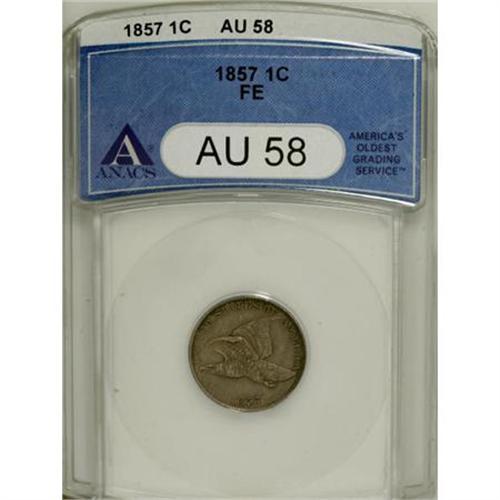 <B>1857 1C AU58 ANACS.</B></I> NGC Census: (93/1776). PCGS Population (151/2082). Mintage: 17,450,000. Numismedia Wsl. Price for NGC/PCGS coin in AU58: $200. (#2016)<BR><BR><B>Coin Engraver:</B> James B. Longacre<BR><BR><b>Shipping:</b> Coins & Currency (<a target="_blank" href="http://www.heritageauctions.com/common/shipping.php">view shipping information</a>)