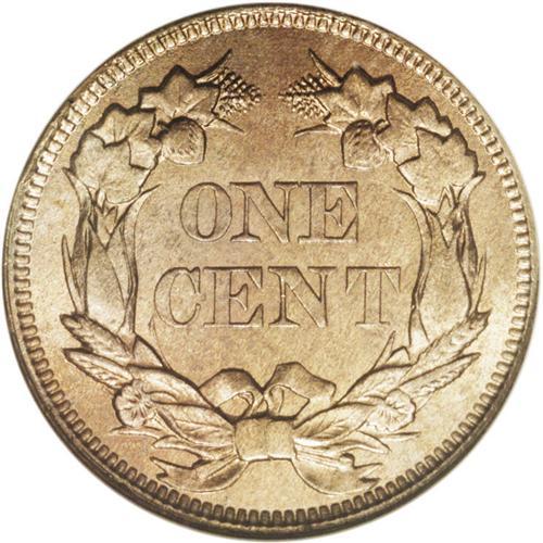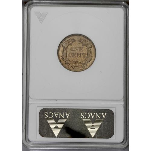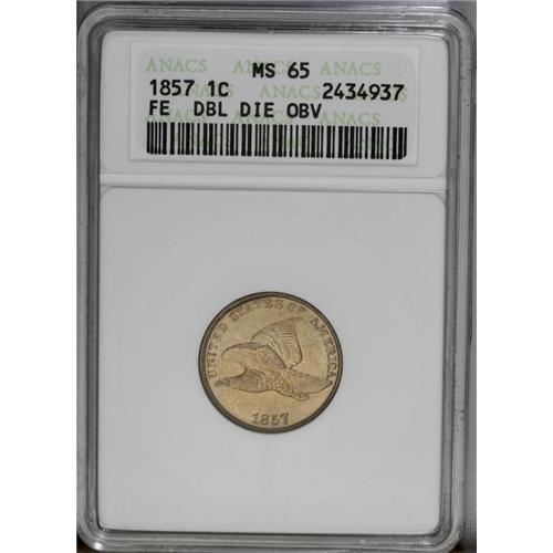 <B>1857<1C>--Doubled Die Obverse--MS65 ANACS.</B></I> FS-002, Snow-4. The eagle's beak and UNITED STATES OF AMERICA are die doubled, strongest on CA. From the 'missing wingtip' hub, but otherwise similar to Snow-3, which is from the 'broken wingtip' hub. A lustrous and crisply struck apricot and green-gold Gem.