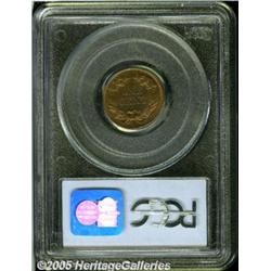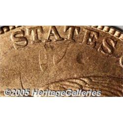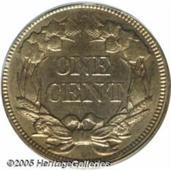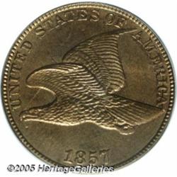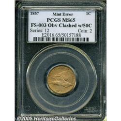 <B>1857 1C Flying Eagle Cent--Obverse Clashed with 50 Cent Dies--MS65 PCGS.</B></I> FS-003, S-9. This is one of the "strange occurrences" coins that came out of the Mint in 1857. The obverse is die clashed with the obverse of a Seated Liberty half! The heaviest part of the clash is through the word AMERICA but portions of the Half Dollar design can be made out elsewhere in the fields. Most believe that young Theodore Eckfeldt was responsible for this and several other mysterious die clashings on 1857 cents. The surfaces are bright and lustrous with a notable amount of golden-reddish patina, particularly over the obverse. Somewhat softly defined on each side, this is probably one of the finest preserved examples of this elusive error.