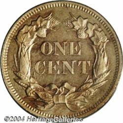 <table><tr><td><table><tr><td>1857 1C Flying Eagle PR64 Cameo PCGS. Snow-1. The 857 in the date is strongly repunched southwest. Struck from the "Style of 1856" dies, which feature boxy letters in the obverse legend, particularly on the O in OF. An exquisitely struck near-Gem with pleasing Cameo contrast between the Flying Eagle and the reflective field. Orange and olive colors illuminate the unabraded surfaces. For pedigree purposes, a tiny mint-made planchet flaw is noted below the eagle's neck, and a tiny area of granular surface resides beneath the wingtip. As a proof, the 1857 is the most elusive issue in the short series, and among proof Small Cents, it is exceeded in rarity only the 1864 With L Cent. <BR><BR><B>Important notice:</B> Heritage usually auctions material at the rate of 200-250 lots per hour. On some occasions eBay Live bid software or the Internet may not be able to keep up with the pace of the auction. We recommend placing a realistic absentee bid now as insurance to avoid disappointment. Occasionally the auctioneer may eliminate or reject an eBay Live bid, and the auctioneer may also reopen a lot after the close of the eBay live bidding (usually because we missed an audience bid), and may reject your bid even if it shows you as the winning bidder. By bidding via eBay Live, you agree that Heritage may award the lot to another bidder at its sole discretion under the circumstances described above or any other reasonable circumstances. Since eBay bids are not shown to us until we open the lot on the floor, we treat those bids just like floor bids. In most cases the floor responds before the eBay bid is presented to us, due to Internet lag time, so for consistency we have made it a policy that floor bids are always considered first over tie eBay live bids. Also please note that all Heritage lots purchased through eBay Live carry a 20% Buyer's Premium. Please make sure you read the Terms and Conditions before you bid. <BR><BR><B>IMPORTANT ANNOUNCEMENT ABOUT RESERVES:</B> Heritage now divulges all reserves on its web site 7 days before every auction. If you want to know whether the reserve on this lot has been met, and if not, what the reserve amount is, please visit this lot page on the HeritageCoin.com web site, or email: bid@HeritageGalleries.com </span></font></td></tr></table></td></tr></table>