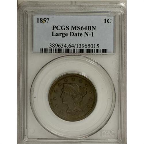 <B>1857 1C Large Date MS64 Brown PCGS.</B></I> N-1. PCGS Population (37/3). NGC Census: (102/40). Mintage: 333,456. Numismedia Wsl. Price for NGC/PCGS coin in MS64: $400. (#1928)<BR><I>Ex: CV-M FPL #44, 11/94.</B></I><BR><BR><B>Coin Engraver:</B> Christian Gobrecht<BR><BR><b>Shipping:</b> Coins & Currency (<a target="_blank" href="http://www.heritageauctions.com/common/shipping.php">view shipping information</a>)