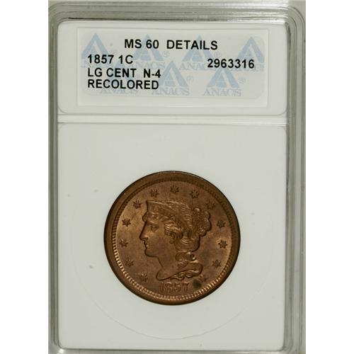 <B>1857 1C Large Date Brown--Recolored--ANACS. MS60 Details.</B></I> N-4. NGC Census: (2/280). PCGS Population (6/132). Mintage: 333,456. Numismedia Wsl. Price for NGC/PCGS coin in MS60: $200. (#1928)<BR><BR><b>Shipping:</b> Coins & Currency (<a target="_blank" href="http://www.heritageauctions.com/common/shipping.php">view shipping information</a>)