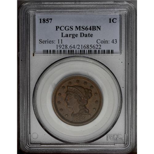 1857 1C Large Date MS64 Brown PCGS. N-1, R.1. Die Stat