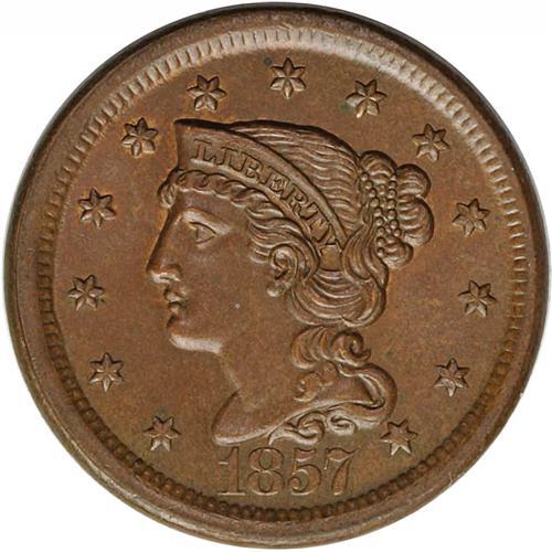 1857 1C Large Date MS65 Brown NGC. N-1, R.1. Brown wit 1857[1C] Large Date. N-1, R.1. MS65 Brown NGC