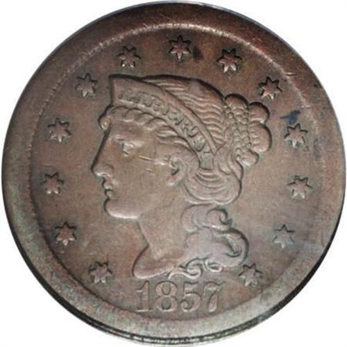 <B>1857 1C Large Date--Broadstruck--PCGS. VF35.</B></I> N-1, R.1. This piece was struck out of the collar, resulting in exceptionally wide borders and an increased diameter of nearly 29 mm. Pleasing light brown surfaces have the usual minor circulation marks that are expected for the grade. EAC 15.<BR><I>From The Beau Clerc Collection.</B></I><BR><BR><B>Coin Engraver:</B> Christian Gobrecht<BR><BR><b>Shipping:</b> Coins & Currency (<a target="_blank" href="http://www.heritageauctions.com/common/shipping.php">view shipping information</a>)