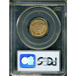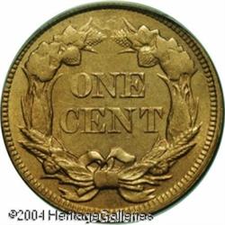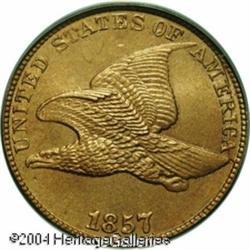 1857 1C MS 64 Obverse Clashed PCGS. FS-003, S-9. T <B>1857 1C MS 64 Obverse Clashed PCGS.</B></I> FS-003, S-9. This is one of the so-called "strange occurrences" coins that came out of the Mint in 1857, and it is the first one we have seen in years. The obverse is die clashed with the obverse of a Seated Liberty Half! The heaviest part of the clash is through the word AMERICA but portions of the Half Dollar design can be made out elsewhere in the fields. Most believe that young Theodore Eckfeldt was responsible for this and several other mysterious die clashings on 1857 Cents. The surfaces are bright and lustrous with a notable amount of golden-reddish patina, particularly over the obverse. Somewhat softly defined on each side, this is probably one of the finest preserved examples of this elusive error Cent. <BR><BR><B>Important notice:</B> Heritage usually auctions material at the rate of 200-250 lots per hour. On some occasions eBay Live bid software or the Internet may not be able to keep up with the pace of the auction. We recommend placing a realistic absentee bid now as insurance to avoid disappointment. Occasionally the auctioneer may eliminate or reject an eBay Live bid, and the auctioneer may also reopen a lot after the close of the eBay live bidding (usually because we missed an audience bid), and may reject your bid even if it shows you as the winning bidder. By bidding via eBay Live, you agree that Heritage may award the lot to another bidder at its sole discretion under the circumstances described above or any other reasonable circumstances. Since eBay bids are not shown to us until we open the lot on the floor, we treat those bids just like floor bids. In most cases the floor responds before the eBay bid is presented to us, due to Internet lag time, so for consistency we have made it a policy that floor bids are always considered first over tie eBay live bids. Also please note that all Heritage lots purchased through eBay Live carry a 20% Buyer's Premium. Please make sure you read the Terms and Conditions before you bid. This lot is being auctioned in conjunction with a live floor auction by Heritage Galleries & Auctioneers. All final auction and invoice information will be supplied by Heritage Galleries & Auctioneers, and all other information should be considered preliminary. Lot:5062