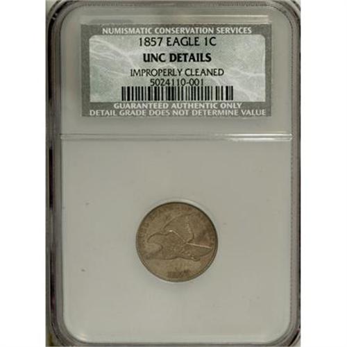 <B>1857 1C --Improperly Cleaned--NCS. Unc Details.</B></I> NGC Census: (9/1754). PCGS Population (38/2009). Mintage: 17,450,000. Numismedia Wsl. Price for NGC/PCGS coin in MS60: $280. (#2016)<BR><BR><b>Shipping:</b> Coins & Currency (<a target="_blank" href="http://www.heritageauctions.com/common/shipping.php">view shipping information</a>)