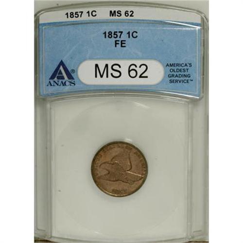 <B>1857 1C MS62 ANACS.</B></I> NGC Census: (232/1458). PCGS Population (329/1640). Mintage: 17,450,000. Numismedia Wsl. Price for NGC/PCGS coin in MS62: $360. (#2016)<BR><BR><B>Coin Engraver:</B> James B. Longacre<BR><BR><b>Shipping:</b> Coins & Currency (<a target="_blank" href="http://www.heritageauctions.com/common/shipping.php">view shipping information</a>\)
