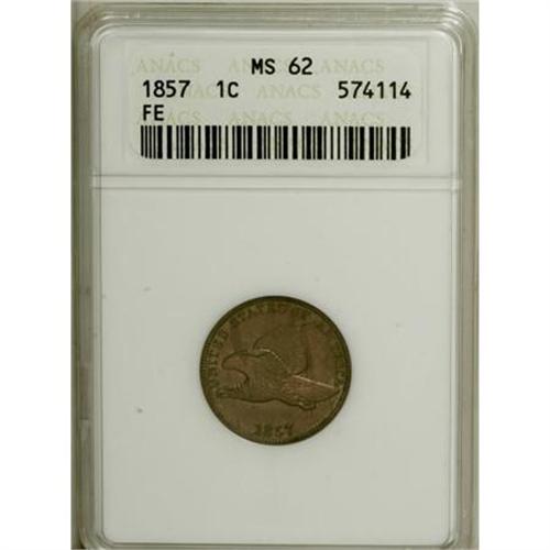 <B>1857 1C MS62 ANACS.</B></I> NGC Census: (232/1462). PCGS Population (331/1648). Mintage: 17,450,000. Numismedia Wsl. Price for NGC/PCGS coin in MS62: $360. (#2016)<BR><BR><B>Coin Engraver:</B> James B. Longacre<BR><BR><b>Shipping:</b> Coins & Currency (<a target="_blank" href="http://www.heritageauctions.com/common/shipping.php">view shipping information</a>)