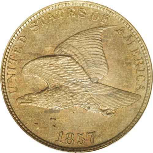 <B>1857 1C MS62 NGC.</B></I> FS-005. FND-002. Snow-8. Clashed with a Seated Quarter reverse die, the reversed outline of the Federal eagle is seen within the wreath. One of three 1857 Flying Eagle Cent varieties with double-denomination clashmark errors; the others are clashed with a Seated Half obverse and a Coronet Double Eagle obverse. All three varieties are highly popular with specialists of the series. This nicely struck piece is satiny and has blended orange, tan, and steel-blue toning. A few minor laminations, as made, are seen in the field above the date.