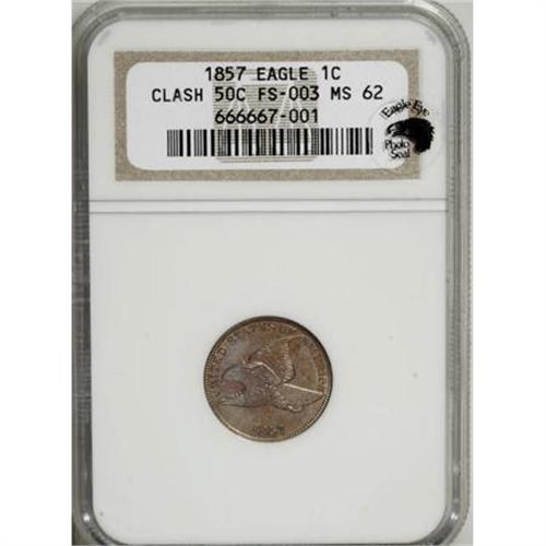 <B>1857 1C MS62 NGC.</B></I> Snow-9. FS-003. The obverse die was clashed with a Seated half obverse die, one of three highly unusual multi-denomination clashed dies found on 1857 cents (the others are Snow-7 and 8). Beautiful peach and steel-blue toning invigorates this lustrous and crisply struck representative.<BR><I>From The Madison Collection.</B></I><BR><BR><B>Coin Engraver:</B> James B. Longacre<BR><BR><b>Shipping:</b> Coins & Currency (<a target="_blank" href="http://www.heritageauctions.com/common/shipping.php">view shipping information</a>)