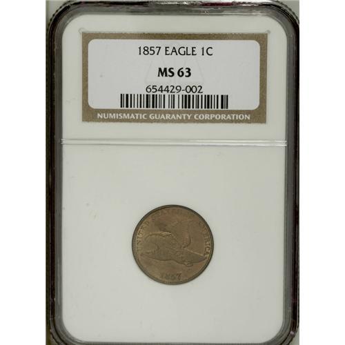 <B>1857 1C MS63 NGC.</B></I> FS-002. Snow-4. Die State B. The obverse legends are die doubled. This well struck representative has consistent dusky orange-red toning. Marks and carbon are trivial for the assigned grade. A good candidate for a variety collection of early small cents.<BR><BR><b>Shipping:</b> Coin/Currency (<a target="_blank" href="http://www.heritageauctions.com/common/shipping.php">view shipping information</a>)