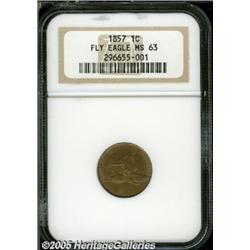 <B>1857 1C MS63 NGC.</B></I> S-15, DDO 3-O-I. UNITED STATES OF AMERICA and the eagle's eye and beak exhibit moderate die doubling. A well struck and satiny piece with original olive-gold color and unmarked surfaces.