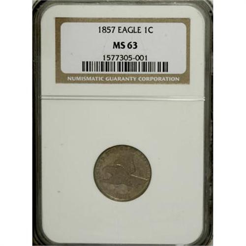<B>1857 1C MS63 NGC.</B></I> A pleasing bluish-tan piece with full luster. The design is a little blunt, especially at the eagle's tail feathers. The eagle has a broken wingtip, reminiscent of the 1858 overdate variety.<BR><BR><B>Coin Engraver:</B> James B. Longacre<BR><BR><b>Shipping:</b> Coins & Currency (<a target="_blank" href="http://www.heritageauctions.com/common/shipping.php">view shipping information</a>)