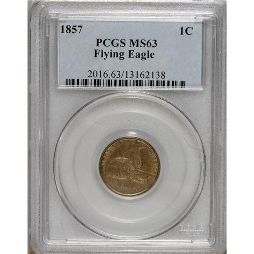 <B>1857 1C MS63 PCGS.</B></I> PCGS Population (642/988). NGC Census: (876/2036). Mintage: 17,450,000. Numismedia Wsl. Price for NGC/PCGS coin in MS63: $615. (#2016)<BR><BR><b>Shipping:</b> Coins & Currency (<a target="_blank" href="http://www.heritageauctions.com/common/shipping.php">view shipping information</a>)