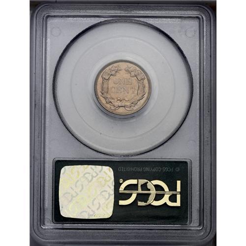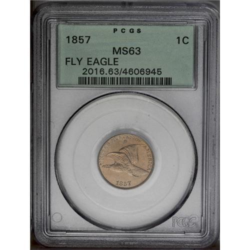 <B>1857<1C> MS63 PCGS.</B></I> Snow-10. The 57 in the date is obviously repunched south. A lustrous almond-gold example with pleasing sharpness on the eagle, although the tail edge and the cotton leaves are soft. A spot near 12 o'clock is the sole detracting. Encapsulated in a green label holder.<BR><I>From The Key Date Coin Collection.</B></I>