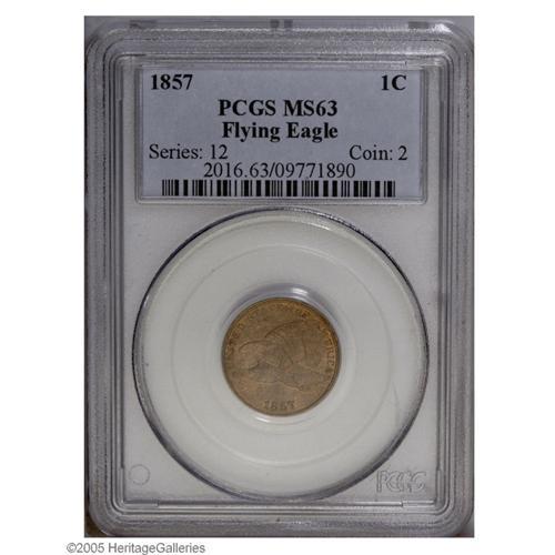 1857 1C MS63 PCGS. Well struck with grainy, matte-like 1857[1C] MS63 PCGS.