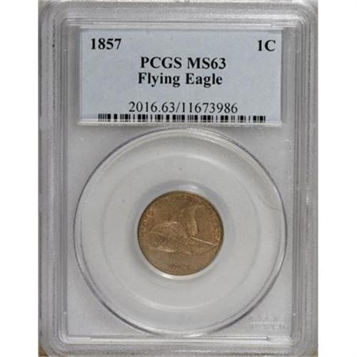 <B>1857 1C MS63 PCGS.</B></I> PCGS Population (652/988). NGC Census: (439/1019). Mintage: 17,450,000. Numismedia Wsl. Price for NGC/PCGS coin in MS63: $615. (#2016)<BR><BR><B>Coin Engraver:</B> James B. Longacre<BR><BR><b>Shipping:</b> Coins & Currency (<a target="_blank" href="http://www.heritageauctions.com/common/shipping.php">view shipping information</a>\)
