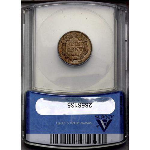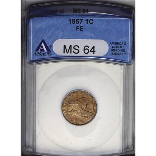 <B>1857<1C> MS64 ANACS.</B></I> Possibly Snow-12. A sharply struck and satiny representative with a woodgrain orange and lilac obverse and a smooth tan-gold reverse. From the Missing Wing Tip hub, and OF AMERICA is lightly but multiply die doubled.