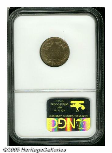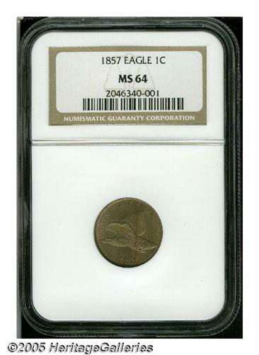 <B>1857<1C> MS64 NGC.</B></I> Honey-tan surfaces with pronounced red iridescence. Some minor strike deficiency is noted on each side that limits the grade. An attractive specimen.