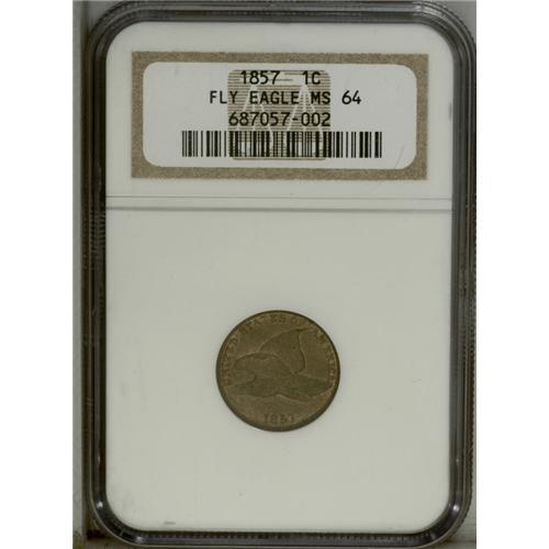 <B>1857 1C MS64 NGC.</B></I> Slightly soft on the eagle's head and tail feathers, ATES OF, and the upper wreath. Mostly tan in color, with gleaming gold highlights in the protected regions and a few bits of powdery turquoise patina near the peripheries. Well preserved and free of marks on each side.<BR><BR><b>Shipping:</b> Coin/Currency (<a target="_blank" href="http://www.heritageauctions.com/common/shipping.php">view shipping information</a>)