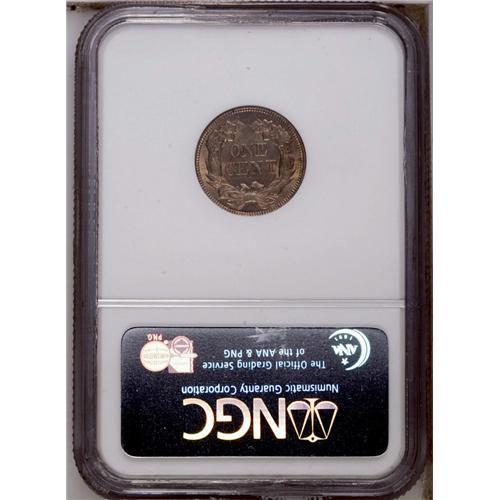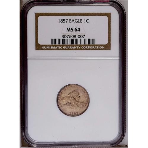 <B>1857<1C> MS64 NGC.</B></I> This beautifully lustrous and richly toned near-Gem displays deep golden-brown and rose color. Well struck except for the eagle's left (facing) wing and OF. The absence of abrasions and spots confirms the overall quality of this high-end example. <BR><BR><B>Important notice:</B> Heritage usually auctions material at the rate of 200-250 lots per hour. On some occasions eBay Live bid software or the Internet may not be able to keep up with the pace of the auction. We recommend placing a realistic absentee bid now as insurance to avoid disappointment. Occasionally the auctioneer may eliminate or reject an eBay Live bid, and the auctioneer may also reopen a lot after the close of the eBay live bidding (usually because we missed an audience bid), and may reject your bid even if it shows you as the winning bidder. By bidding via eBay Live, you agree that Heritage may award the lot to another bidder at its sole discretion under the circumstances described above or any other reasonable circumstances. Since eBay bids are not shown to us until we open the lot on the floor, we treat those bids just like floor bids. In most cases the floor responds before the eBay bid is presented to us, due to Internet lag time, so for consistency we have made it a policy that floor bids are always considered first over tie eBay live bids. Also please note that all Heritage lots purchased through eBay Live carry a 20% Buyer's Premium. Please make sure you read the Terms and Conditions before you bid. This lot is being auctioned in conjunction with a live floor auction by Heritage Galleries & Auctioneers. All final auction and invoice information will be supplied by Heritage Galleries & Auctioneers, and all other information should be considered preliminary. Lot:353 <BR><BR><B>Winning Notification and Billing:</B> After the FINAL session in this auction is complete, Heritage will send e-mail and snail mail invoices. This process normally takes several days. All final auction and invoice information will be supplied by Heritage Galleries & Auctioneers, and all other information should be considered preliminary. <BR><BR>This auction will be conducted on a live auction floor and over the Internet through eBay Live. If you choose to place an absentee bid, please take a moment to <font color='#0000ff'><u><a href='http://pages.ebay.com/liveauctions/help/before/laabsentee.html'>learn how eBay Live absentee bidding works</a></u></font><font color='#000000'>